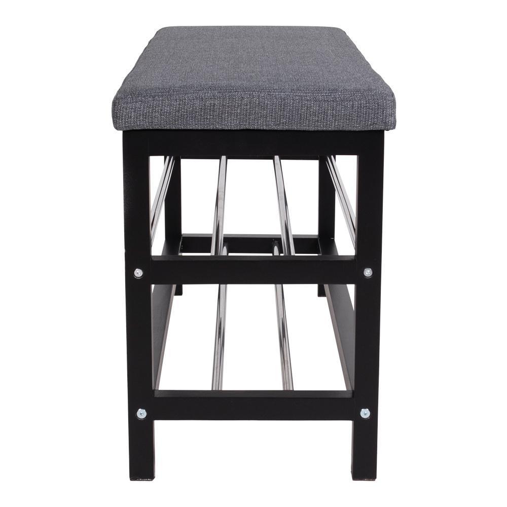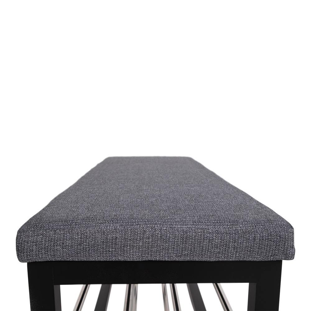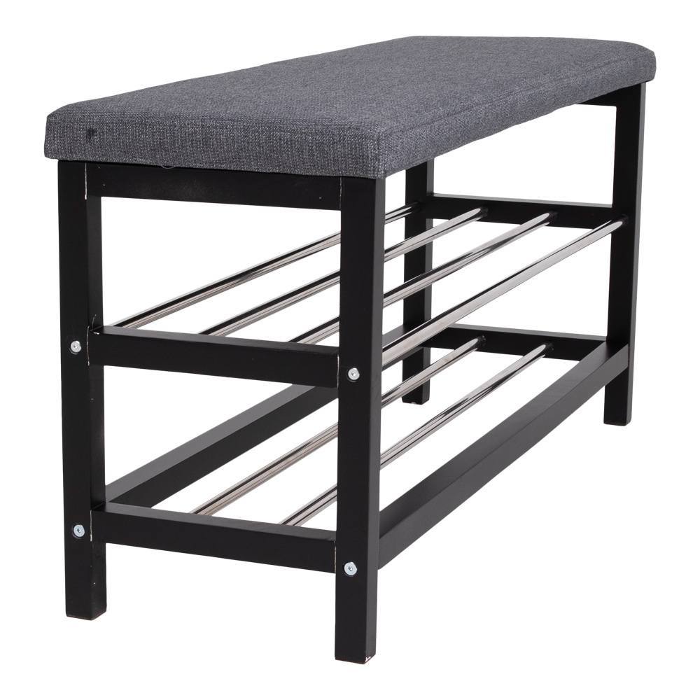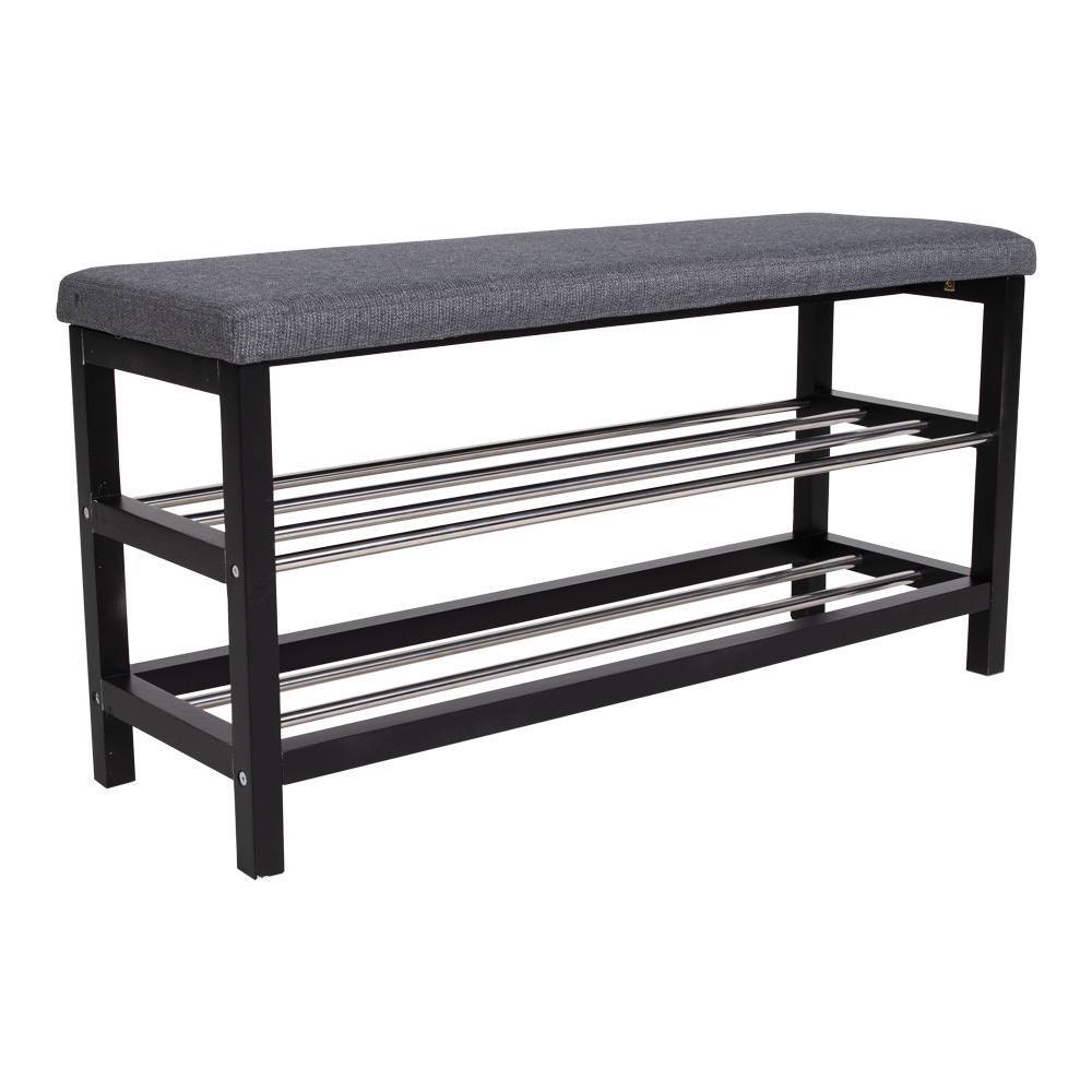 Bænk i grå og sort med hynde og 2 hylder.