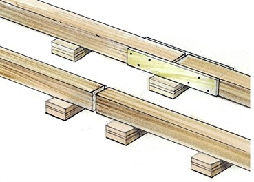 • At højst, hver 3. nåletræsbræt stødes/samles oven på samme strø/bjælke dvs at der er min. 2 brædder i mellem 2 endesamling på samme strø/bjælke.