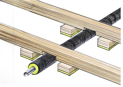 Over enderne skal strøerne holde ca. 10 mm afstand til vægge o.lign. Det kan være nødvendigt at udskære i strøen for at give plads til varmerør e.lign. I sådanne tilfælde skal der være min 10 mm friafstand til installationen. Udskæres der i strøen skal der udføres ekstra opklodsninger. Se også figur 2
