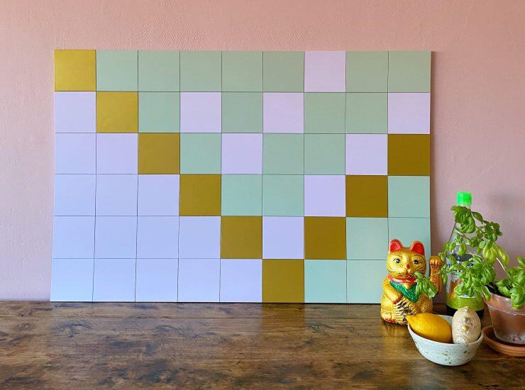 Prisen er for HELE kittet. Alt hvad du skal bruge. Tape, afrensning, lim, montageplade 90×60, sugekop og 55 fliser (heraf 9 smukke messingfliser).