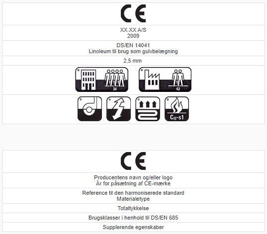 Gulvbelægninger af linoleum, vinyl, kork og gummi skal være CE-mærkede. Den harmoniserede standard DS/EN 14041 ligger til grund for CE-mærkningen og gælder for produktion og anvendelse i Europa.