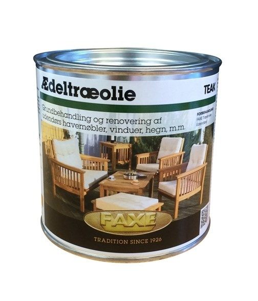 FAXE Ædeltræsolie anvendes som behandling og renovering af bl.a. havemøbler af træ. FAXE Ædeltræsolie er også velegnet til behandling af vinduer og døre samt træterrasser. FAXE Ædeltræsolie beskytter træet mod klimaets indflydelse. Pigmenterne supplerer farven i træet og forhindrer træet i en tidlig ældning. Struktur og tegning bevares ved behandling med FAXE Ædeltræsolie og giver samtidig en effektiv UV-beskyttelse. Vær opmærksom på at nyt frisk ædeltræ (teak, mahogni, meranti, nyatoh og andre eksotiske træsorter) indeholder egne naturlige olier. Man bør derfor afrense med FAXE Trærenser Udendørs inden oliering.