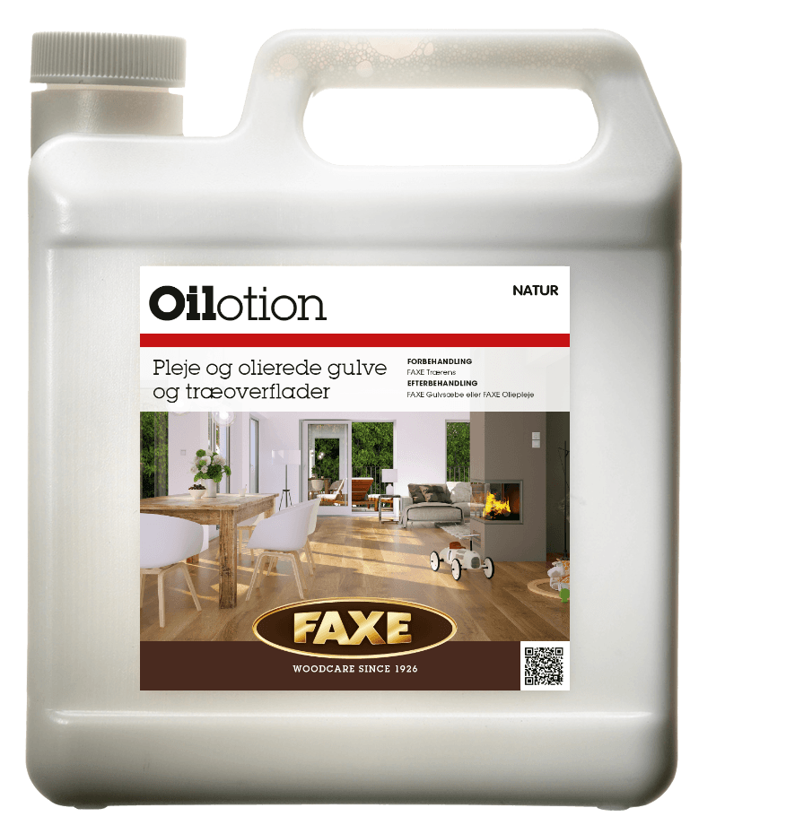 FAXE Oilotion er specielt udviklet til en nem og hurtig genopfriskning og vedligeholdelse af oliebehandlede gulve. Produktet har en hurtig tørretid og gulvet er hurtig klar til brug. FAXE Oilotion er fremstillet af vegetabilske olier og voks. FAXE Oilotion både olierer og plejer træet, samt giver en gennemsigtig, beskyttende og væskeafvisende film på gulvets overflade, som gør at gulvet bliver nemt at vedligeholde. På naturolierede gulve fremhæver og vedligeholder FAXE Oilotion den dybe gyldne glød, der er i træet.
