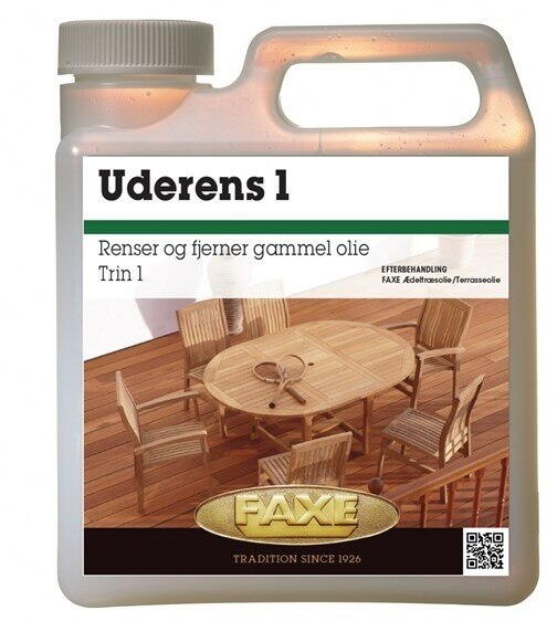 FAXE Uderens 1 indgår i et system med 2 aktive rengøringsmidler for ubehandlede eller olierede træoverflader, som anvendes efter hinanden. FAXE Uderens 1 dybderenser snavs, grå indfarvninger og korrosionspletter, rester af forvitrede oliebehandlinger og belægninger. FAXE Uderens 1 løsner fedt og snavs med dybdevirkning, FAXE Uderens 2 neutraliserer rester af FAXE Uderens 1 og lysner træet. Bør ikke anvendes på glas eller glaserede overflader.
