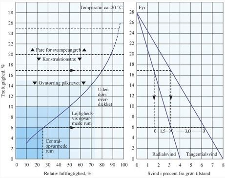 Figur 2: Fugtligevægtskurven/sorptionskurven (til venstre) viser sammenhængen mellem den relative luftfugtighed ved ca. 20C, og kuven til højre viser beregning af svind ved ændring af ligevægtsfugtigheden. Hastigheden, hvormed vandet optages/afgives i trægulvet kan påvirkes ved at give træet en overladebehandling. Jo tættere overfladebehandling man giver trægulvet, jo langsommere reagerer det. Herud over er gulvets tykkelse også en vigtig parameter. Tykke brædder/stave er længere tid om at opnå en ligevægtsfugt end tynde brædder/stave.