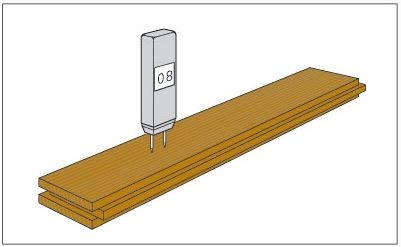 Fig. 7. Måling af træfugt med elektrisk modstandsmåler. Målingen er baseret på måling af modstanden mellem to elektroder (ben) som stikkes ned i træet. Der skal måles på langs ad årene og mindst 300 mm fra endetræ.