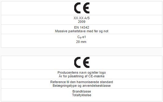 CE-mærket vil typisk indeholde følgende oplysninger for massive parketstave i brandklasse Cfl-s1, jævnfør DS/EN 14342 - tabel 1:
