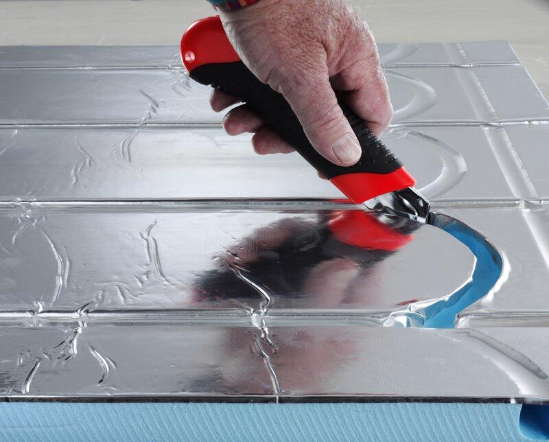 Når retur sporet skal benyttes skæres aluminium belægningen let med en kniv. Herefter presses folien ned i kanalen med bagsiden af kniven.