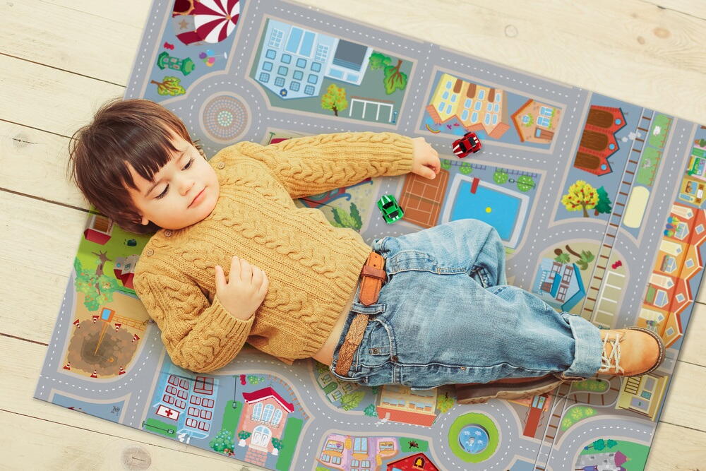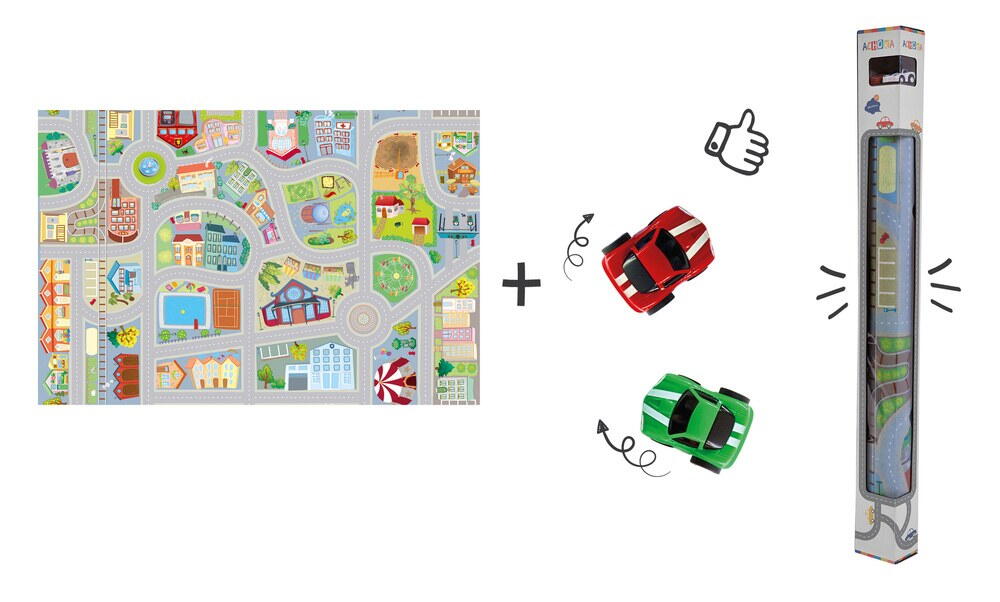 Et tyndt filt tæppe til leg for de mindste inkl. 2 små biler i plast. Farven på bilerne kan variere i forhold til billedet!