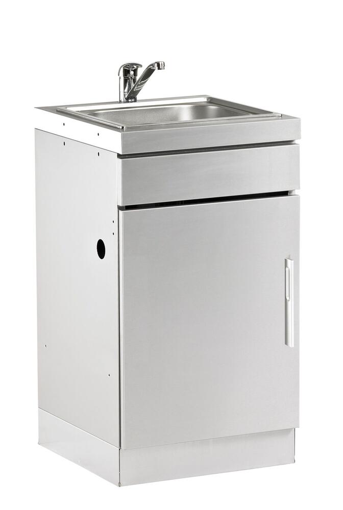 Udekøkken skabsmodulmed køkken vask i rustfrit stål. hanen kan både sættes til kold og varmt vand. Nyd en stærk præstation hver gang. Discovery udekøkken er et modulært system, der lader dig tilføje næsten alt fra skuffer og skabe til køkkenvasken.