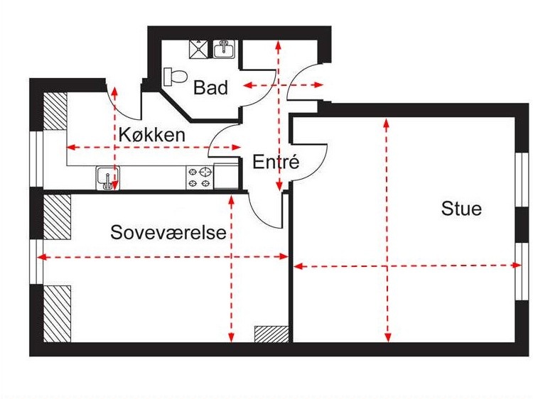 Nedenfor har vi illustreret hvorledes der skal måles op. Det er vigtigt at der måles i fuld længde – hvilket betyder at der skal måles helt ud i indhak, under vinduer, i døren, under radiator, samt i køkkener under køleskab og opvaskemaskine. Der hvor pilene slutter skal der som minimum måles til.