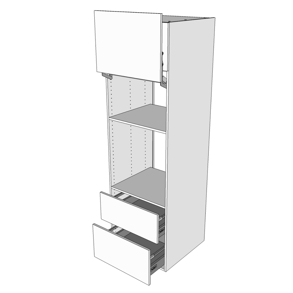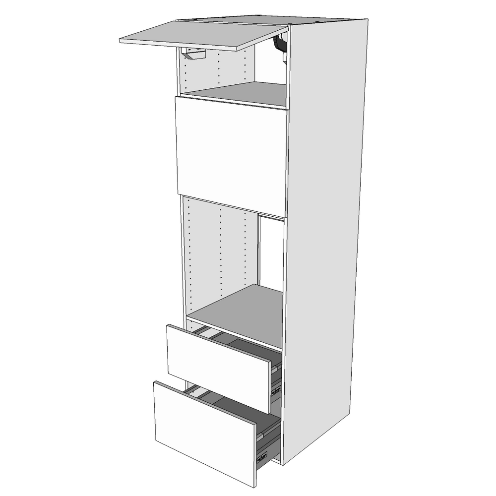 Model: Indbygningsskab til ovn og microovn med toplåge, microovnslåge, 3 hylder og 2 skuffer med softclose og deludtræk.
