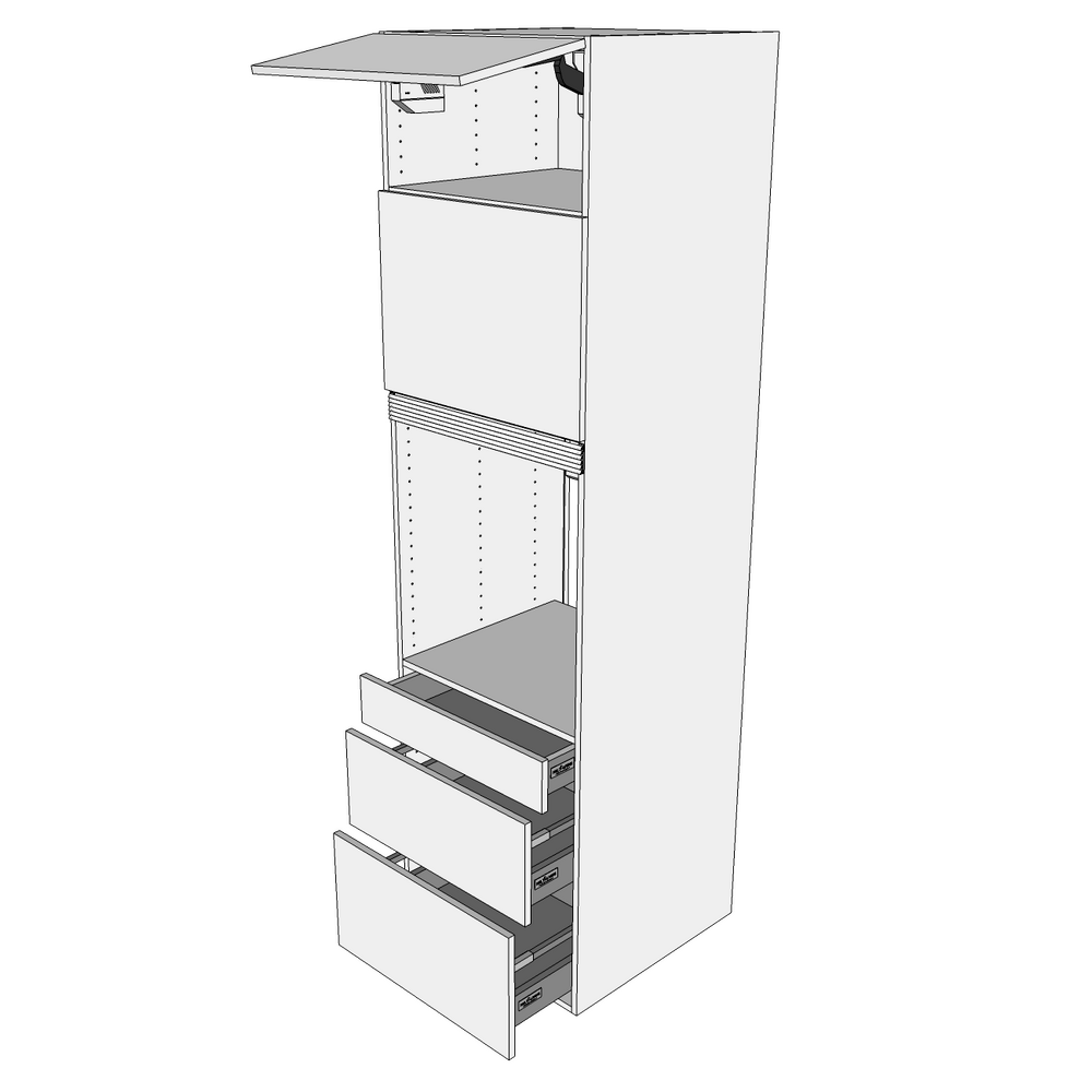 Model: XL Indbygningsskab til ovn og microovn med toplåge, microovns låge, 3 hylder og 3 skuffer med softclose og deludtræk.