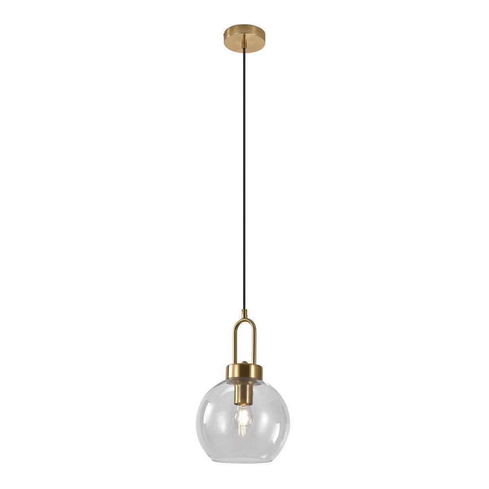 Pendel i kugleformet klar glas og messingfatning. 150 cm stofledning.