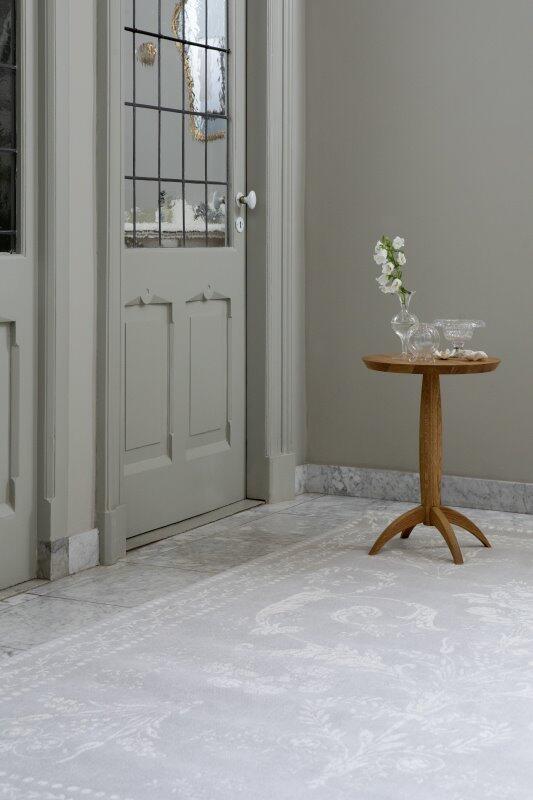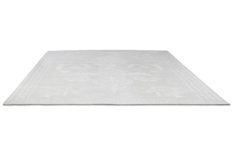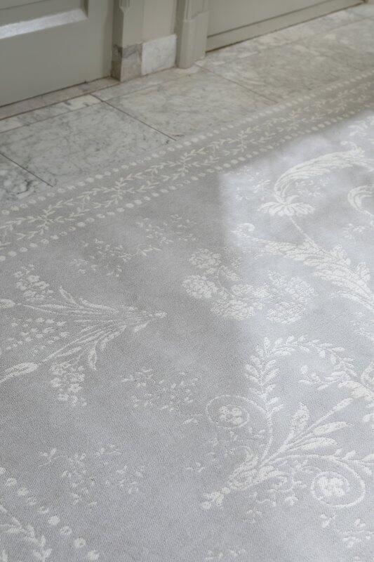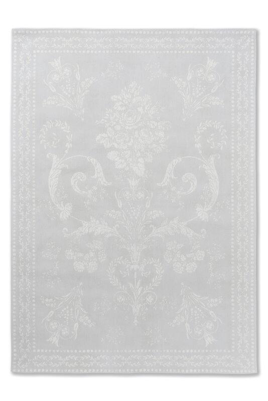 Damask-vævet tæppe udsmykket med elegante lysekroner og romantiske rosenbuketter.