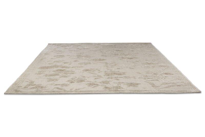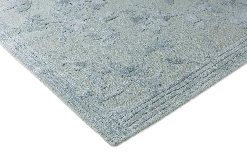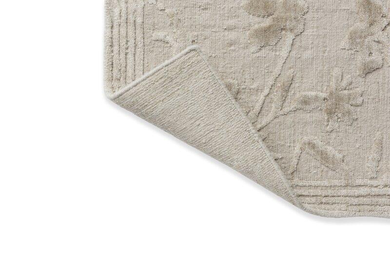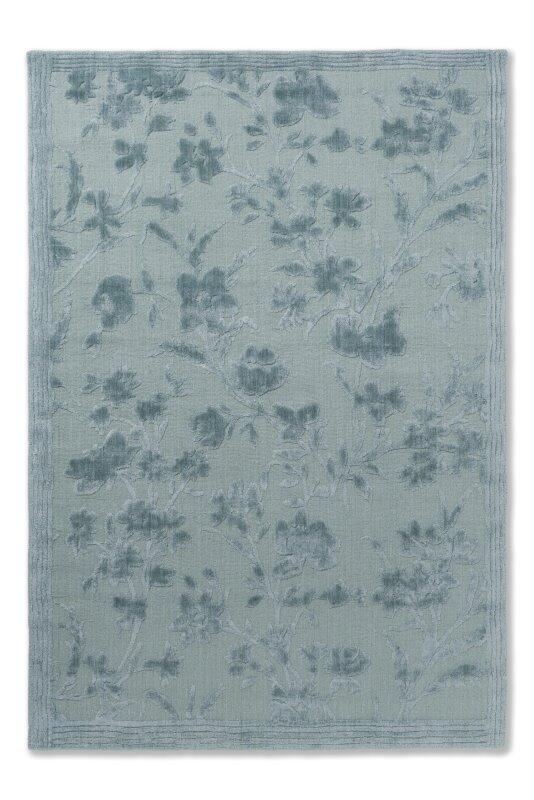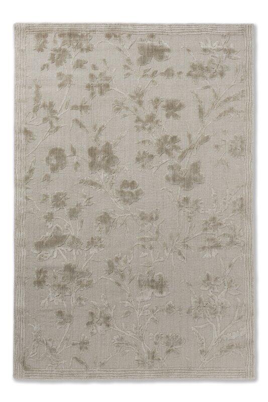Rye-designet viser et blomstermotiv med store blomsterhoveder, blade og stængler. Tæppet som er håndvævet, er kombineret med tre kvaliteter garn. Den matte uld og bomulden, som danner baggrunden, er perfekt til at fremhæve blomstermotivet, som er lavet i bambus silke. Bambusgarnet giver dette tæppe et element af luksus og glans.
