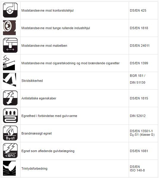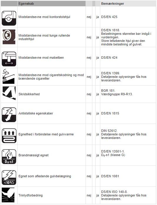Egenskaber som indgår i EN-klassifikationen af linoleumsgulve.
