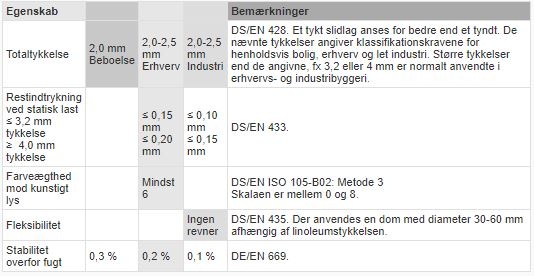 Checkliste 1. Klassifikation af linoleum til brug i henholdsvis boliger, erhverv og industri sker på grundlag af tykkelsen. Klasserne kan yderligere underdeles i moderat, normal, høj (og meget høj). Øvrige egenskaber overholder for EN-klassificerede produkter de markerede værdier. De angivne værdier er minimumsværdier.