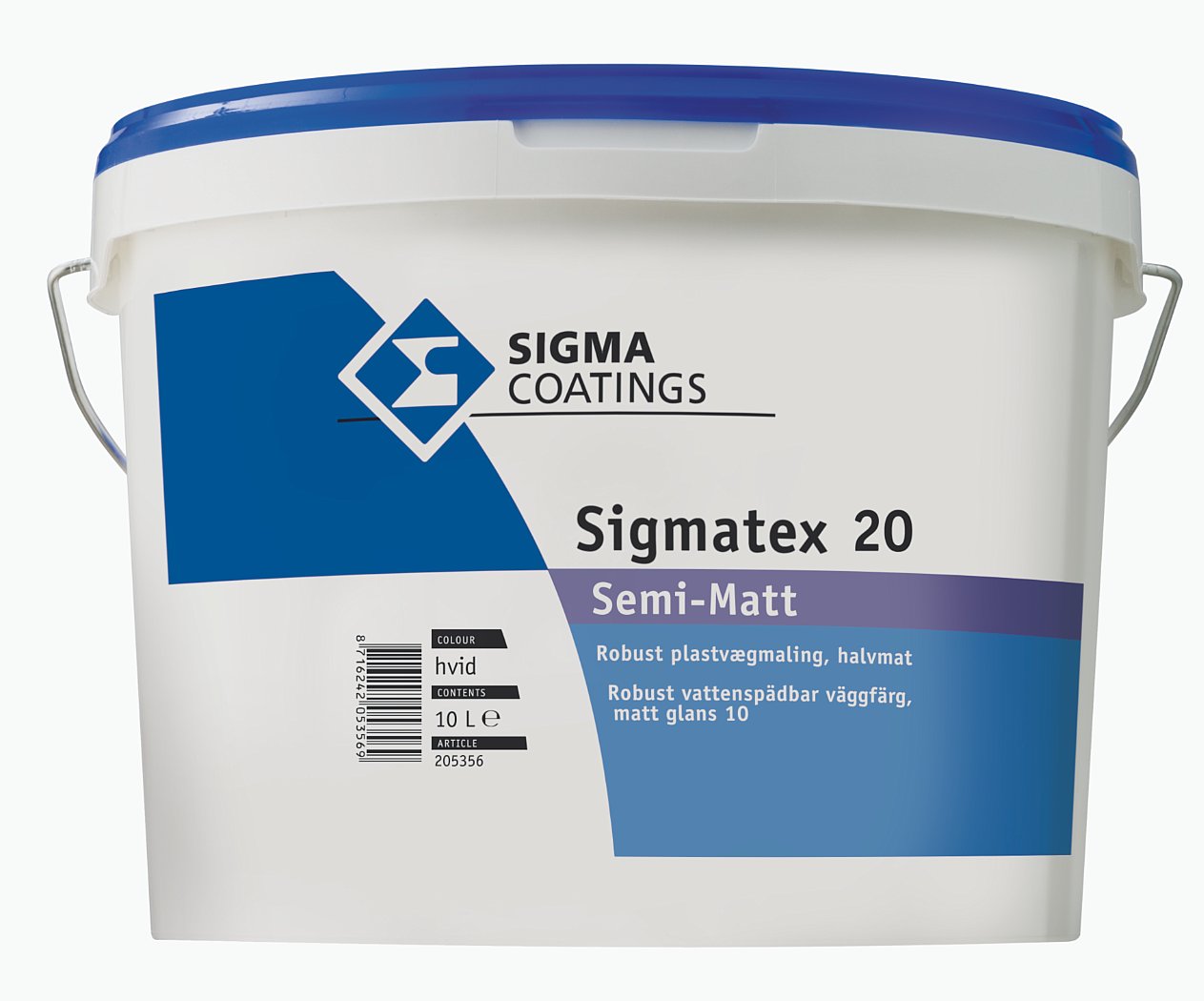 Sigmatex 20 er en semi-mat højkvalitets vægmaling med Ecolabel. Nem at arbejde med på grund af sine gode stryge- og fordelingsegenskaber. Dækkeevnen og holdbarheden er i top, og endelig opnår du et perfekt resultat med en slidstærk og rengøringsvenlig overflade. Kort sagt: Alle de positive egenskaber, som professionelle ønsker sig af en vægmaling. Sigmatex 20 kan tones i alle farver i Sigmas omfattende farvekollektioner.