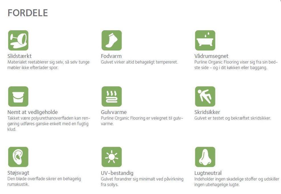 Moland Purline Organic Flooring er et organisk produkt, produceret af naturlige og bæredygtige råstoffer, herunder raps eller ricinusolie og kridt.  For gulvet gælder det, at der er lagt stor vægt på at bevare det naturlige trælook. Det naturlige trælook afspejler sig i opbygningen af gulvet, hvor Toplaget er et PU-toplag med overfladestruktur og mønsterpapir samt er det stabiliseret med ecuran. Herefter kommer der tre yderligere lag, der er med til at definere gulvet. Opbygningen er således, at efter Toplaget kommer Grundlaget, der er et komposit materiale af højtydende ecuran, herefter kommer Bærepladen som er AquaProtect, og til sidst en Isoleringsmåtte i Sound-Protect Eco.
