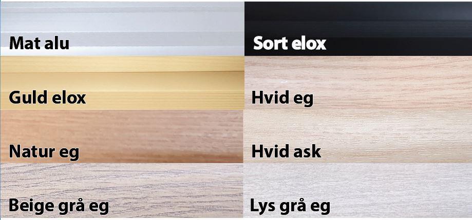 Farver: Mat alu, Guld elox, Sort, Hvid eg, Natur eg, Hvid ask, Beige grå eg og Lys grå eg.