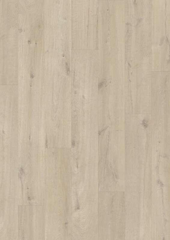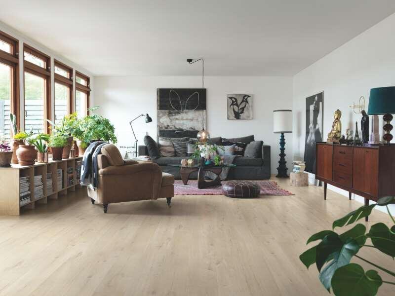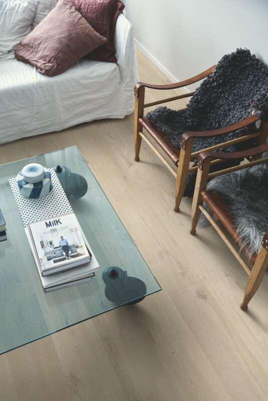 En eg med revner og knaster, men ikke for udtalt. Den lyse, naturlige farve passer til forskellige indretningstyper.