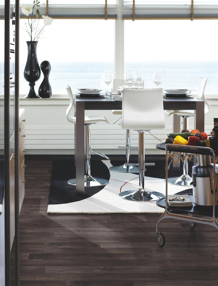 Dark Brown Oak har klassisk plankelængde med en let poleret struktur, der følger træets årer i alle detaljer, suppleret med en silkemat finish. Takket være AquaSafe-teknologien tilbyder dette laminatgulv enestående beskyttelse mod vand.