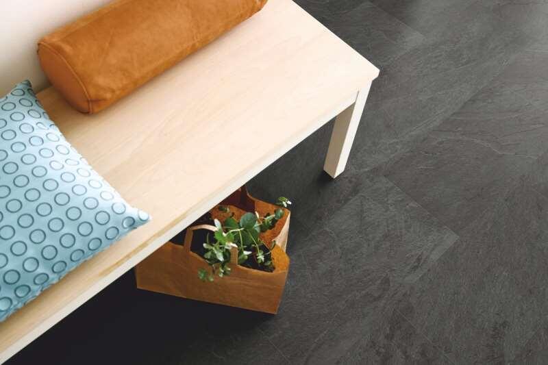 Black Scivaro Slate giver et klassisk Black Scivaro Slateudseende, der smukt matcher næsten alle typer møbler – specielt hvide – og er ideel til entréer, køkkener eller stuer. Flisedesignet er perfekt til rum, hvor du ønsker et udseende af keramiske fliser, men varmen og blødheden fra vinyl. Med to fliser pr. planke, er montering både hurtig og effektiv. Til kommercielle anvendelsesformål, hvor man foretrækker et limet gulv, anbefaler vi vores Optimum kvalitetsniveau. Optimum gulvene er lette at lime på et undergulv vha. Pergo vinyllim. Denne lim er af højeste kvalitet og er blevet udviklet specielt til Pergo vinylgulve.