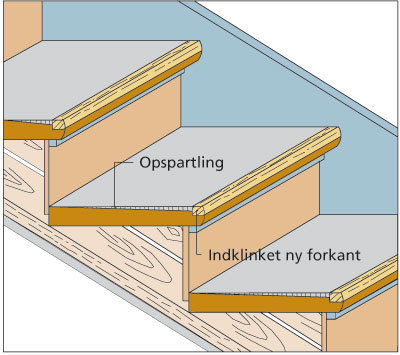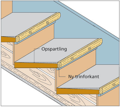 Den gamle trinforkant skæres af ved platlisten og erstattes med den nye trinforkant, som limes og skrues fast til den tilbageblevne del af trinnet. Herefter spartles trinfladen mellem den nye trinforkant og stødtrinnet. Den nye trinforkant kan være med eller uden fals til ny trinforkantskinne.