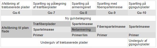 Samlinger i krydsfinér-, spån- og træfiberplader samt skrue- og sømhuller i krydsfinér- og spånplader må ikke spartles. Normalt skal undergulve af gipsplader for textile og halvhårde gulvbelægninger være fuldspartlet. Gipspladeleverandøren bør eventuelt spørges til råds herom.