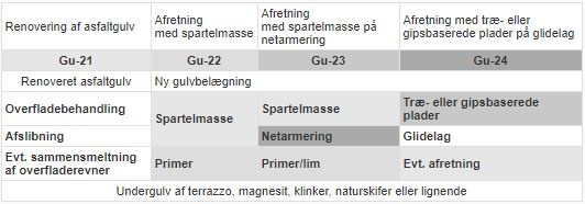 Afslibning og overfladebehandling af gamle asfaltgulve (metode Gu-21) vil ikke blive yderligere omtalt. For yderligere oplysninger henvises til leverandører af asfaltgulve.