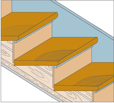 Afhængig af sliddet kan der benyttes en 12 x 12 mm eller 21 x 21 mm fyrretræsliste. Listen fræses ned i trinforkanten og fastgøres, så oversiden er i niveau med - eller lidt over trinnets højeste punkt. Herefter spartles trinfladen imellem listen og stødtrinnet.