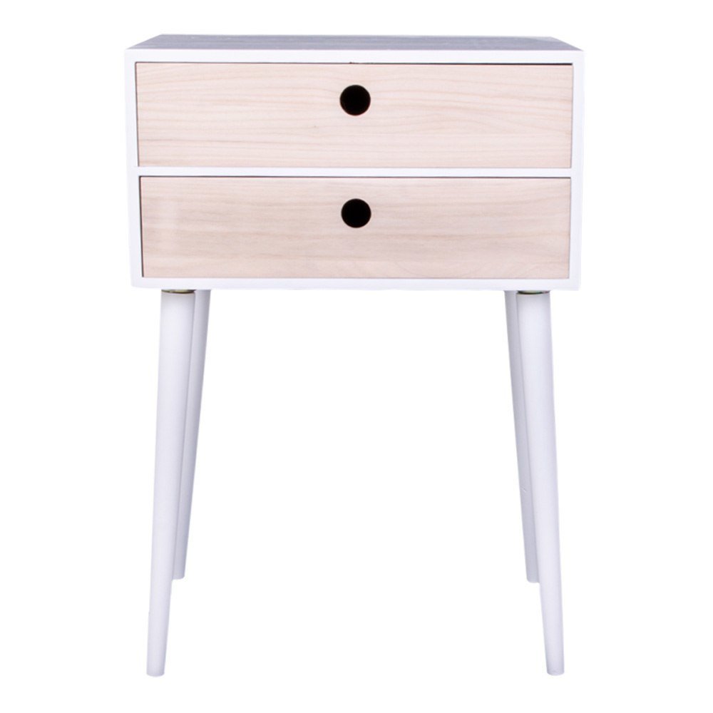 Sengebord i hvid med 2 skuffer i naturtræ. Sengebordet er placeret på 4 ben i samme hvide farve som rammen. Dette skaber en stilren helhed.