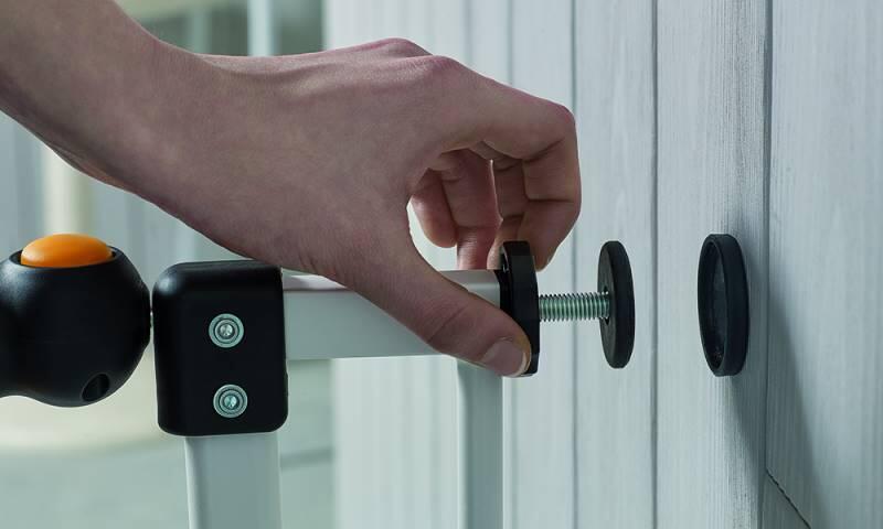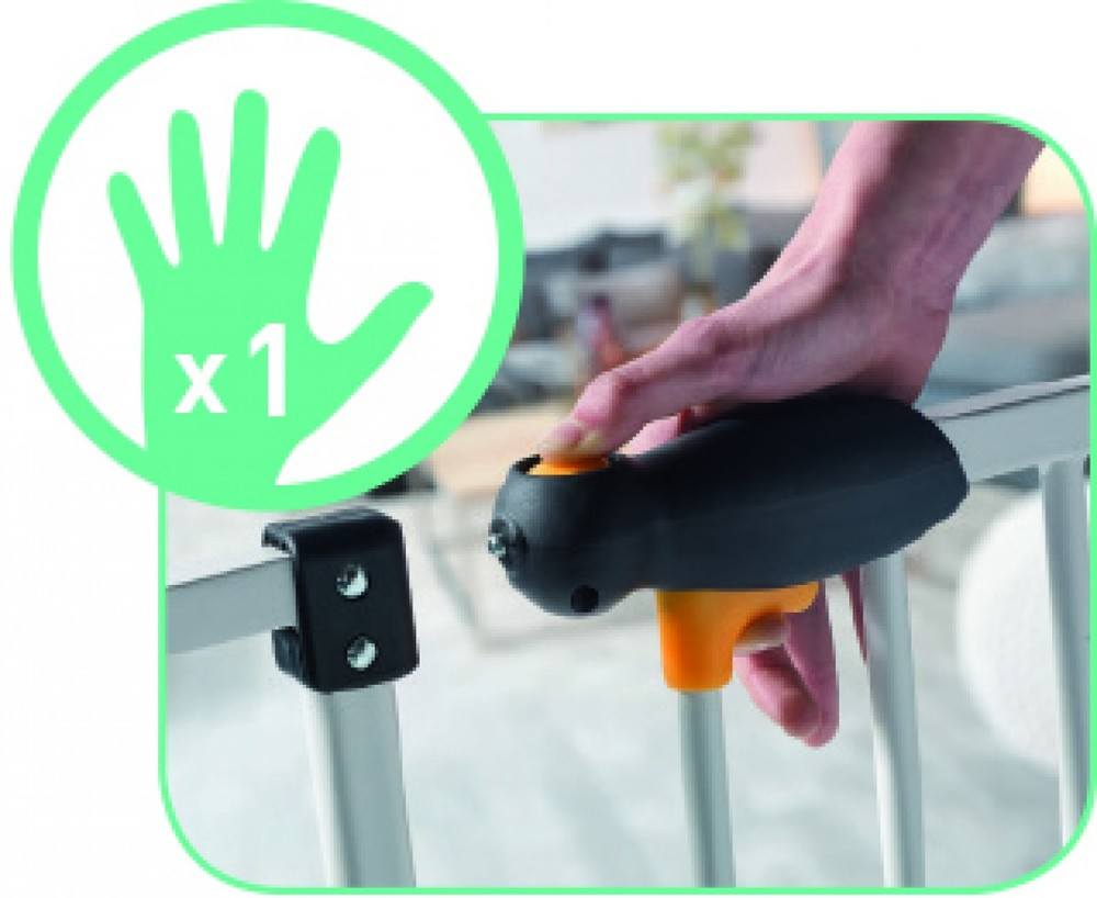 Aalto Sikkerhedsgitter i hvidlakeret stål, som kan åbnes til begge sider. Kan betjenes (åbnes/lukkes) med 1 hånd. Passer til døråbninger,ved trapper m.m. Ekspansionsstykke på 8 cm kan købes separat (varenr. 2500052)