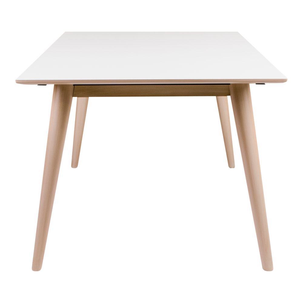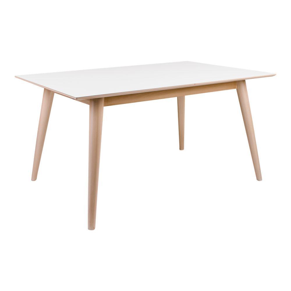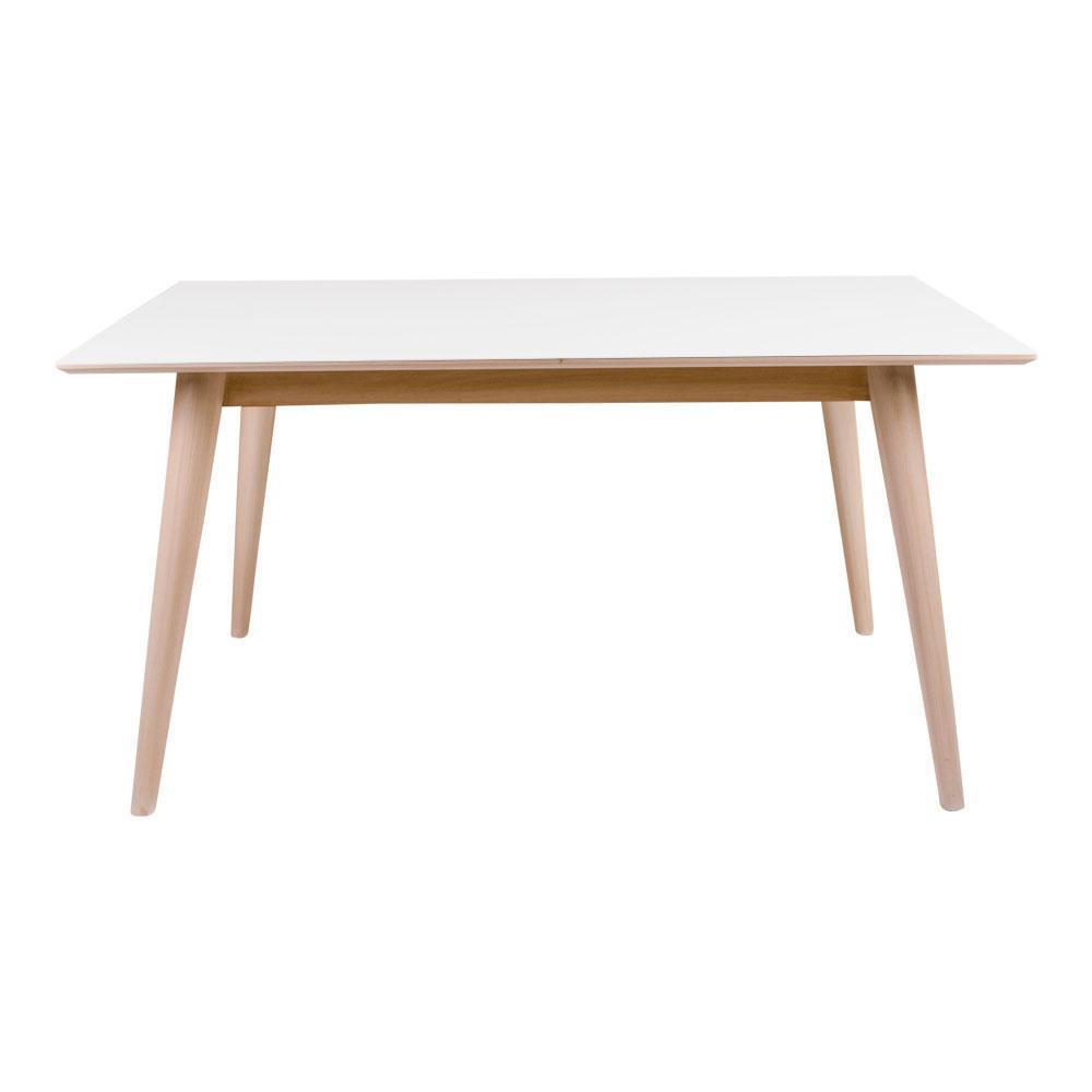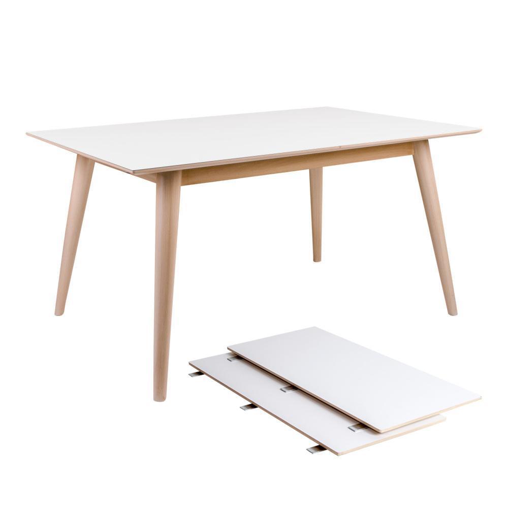 Spisebord med hvid bordplade, natur kant og natur ben. Et moderne spisebord i flot og stilrent design, med et nordisk præg. Der medfølger 2 tillægsplader.
