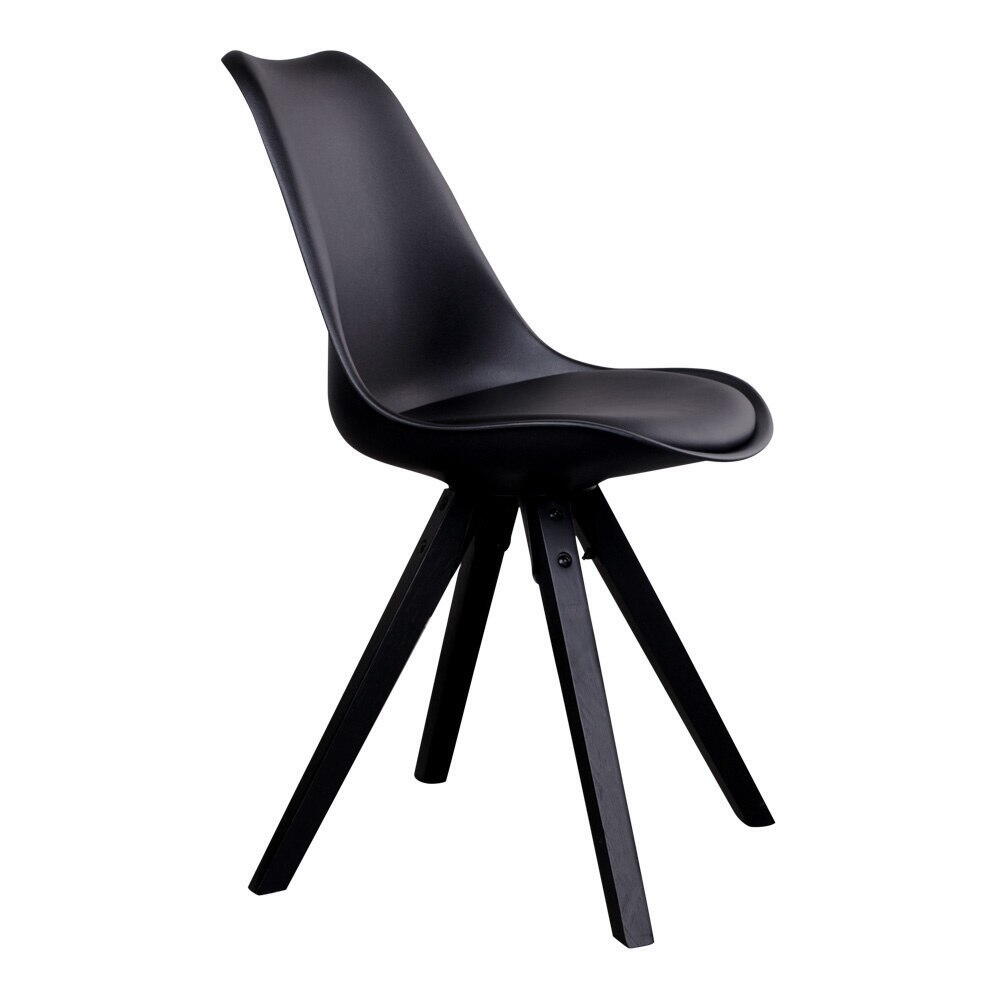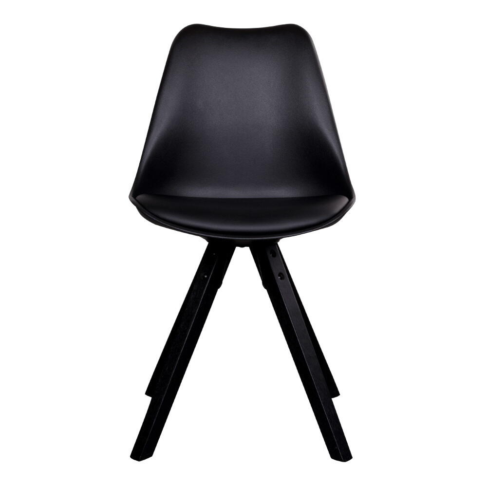 Elegant spisebordsstol i sort formstøbt plast med kunstlæder sæde som giver en høj sidde komfort. Stellet er i sortmalet træ og giver et stilrent og nordisk udtryk.