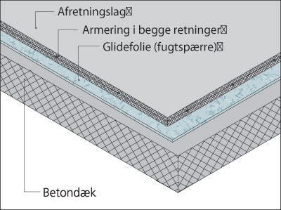 Figur 5. Afretningslag uden vedhæftning til underlaget. På betondæk med høj restbyggefugt eller betondæk med risiko for indtrængende eller opstigende fugt, fx terrændæk og kældergulve, benyttes PE-folie eller lign. som kombineret fugtspærre og glidelag mellem betondæk og afretningslag.