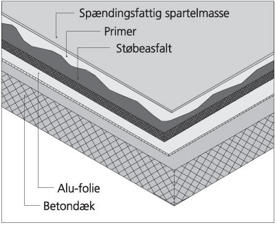 Figur 6. Afretningslag af støbeasfalt. Asfalten udlægges på et damptryk- udligningslag af alu-folie.