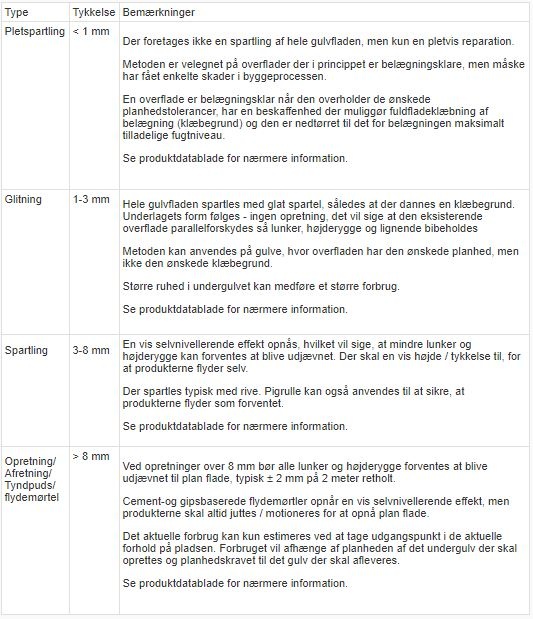 For afretning med cementbaseret flydemørtel skal der dog regnes med et minimumsforbrug på 16 kg/m2.