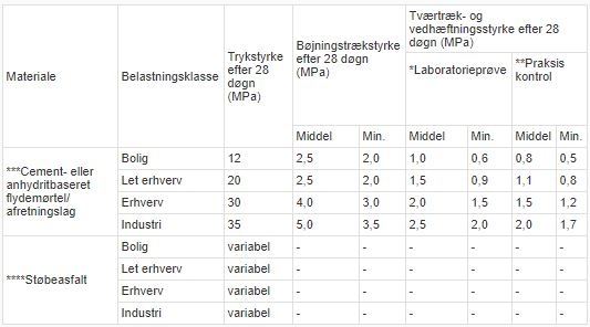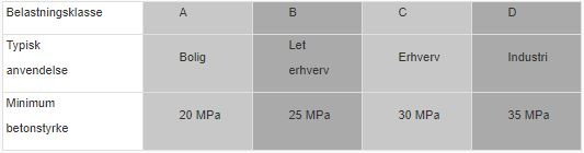 Tabel 4. Belastnings- og styrkeklasser for betongulve i henhold til "Gulvkonstruktioner af Beton"