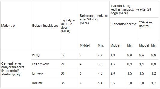 ** Praksis kontrol: Værdi, der skal kunne opnås, hvis der skal foretages kontrol på byggepladsen. Du kan læse om, hvorledes afretningsmaterialers trækstyrke kan bestemmes på byggepladsen i Gulvbranchens publikation "Trækstyrke vejledning"