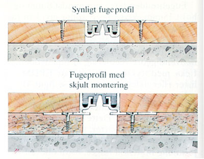 Figur 5. Dilatationsfuge i trægulv. Øverst: Synligt standardprofil til montering oppefra. Bedst egnet som dilatationsfuge på limede/skruede gulve Nederst: Skjult standardprofil, der monteres på undergulvet, før trægulvet lægges.