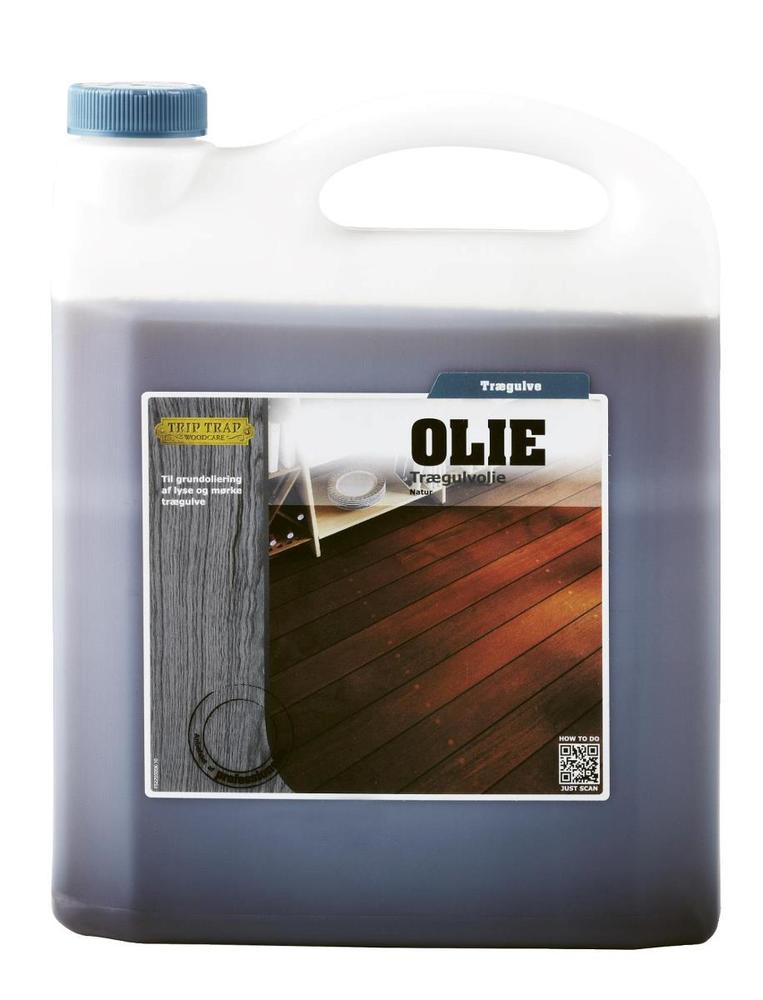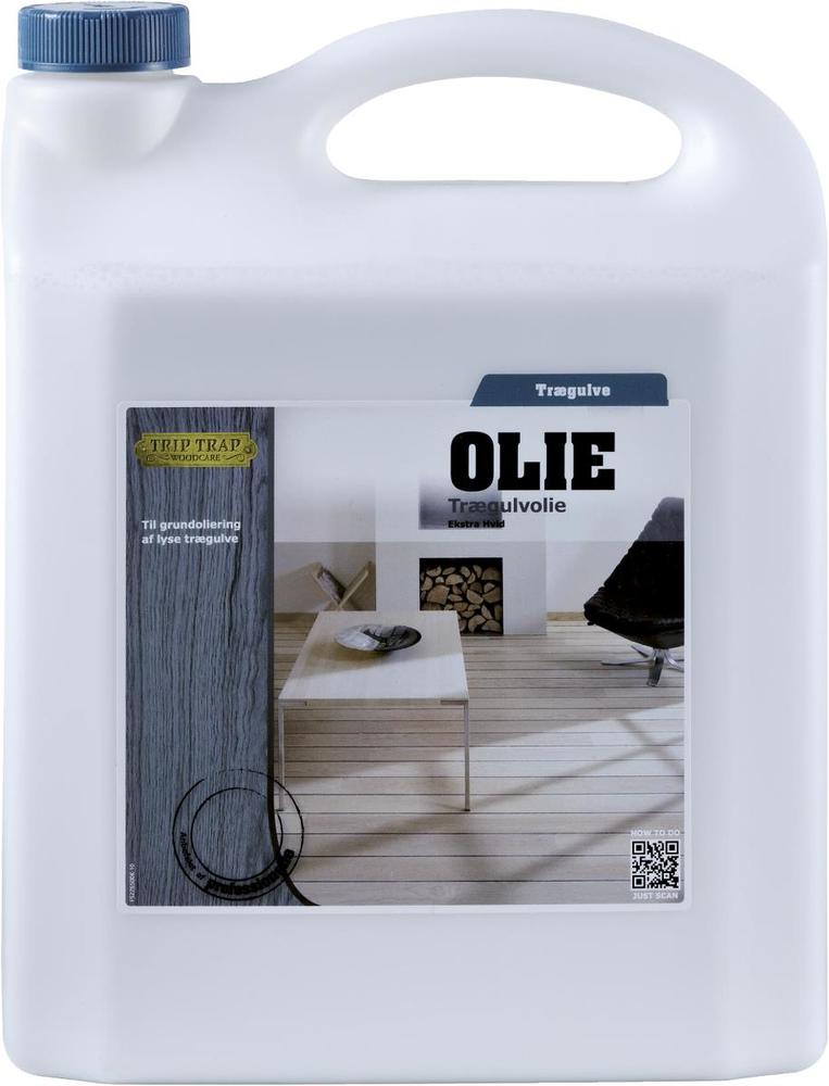 Trip Trap Trægulvolie Natur og Ekstra Hvid anvendes til grundoliebehandling af alle ubehandlede og ludbehandlede, afslebne eller nye trægulve (indendørs). Natur anvendes til mørke gulve som merbau, teak, mahogni, kirsebær, keruing m.fl. Ekstra hvid anvendes til nåletræsgulve samt lyse hårdttræsgulve som bøg, eg, ask, hevea m.fl.Oliebehandlingen kan foretages både manuelt og maskinelt. Maskinel oliebehandling anbefales ved gulvflader over 15 m².