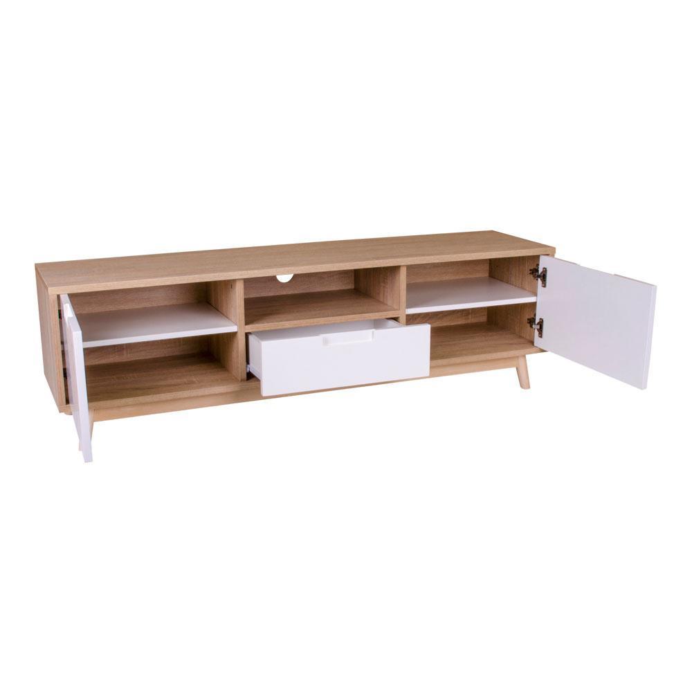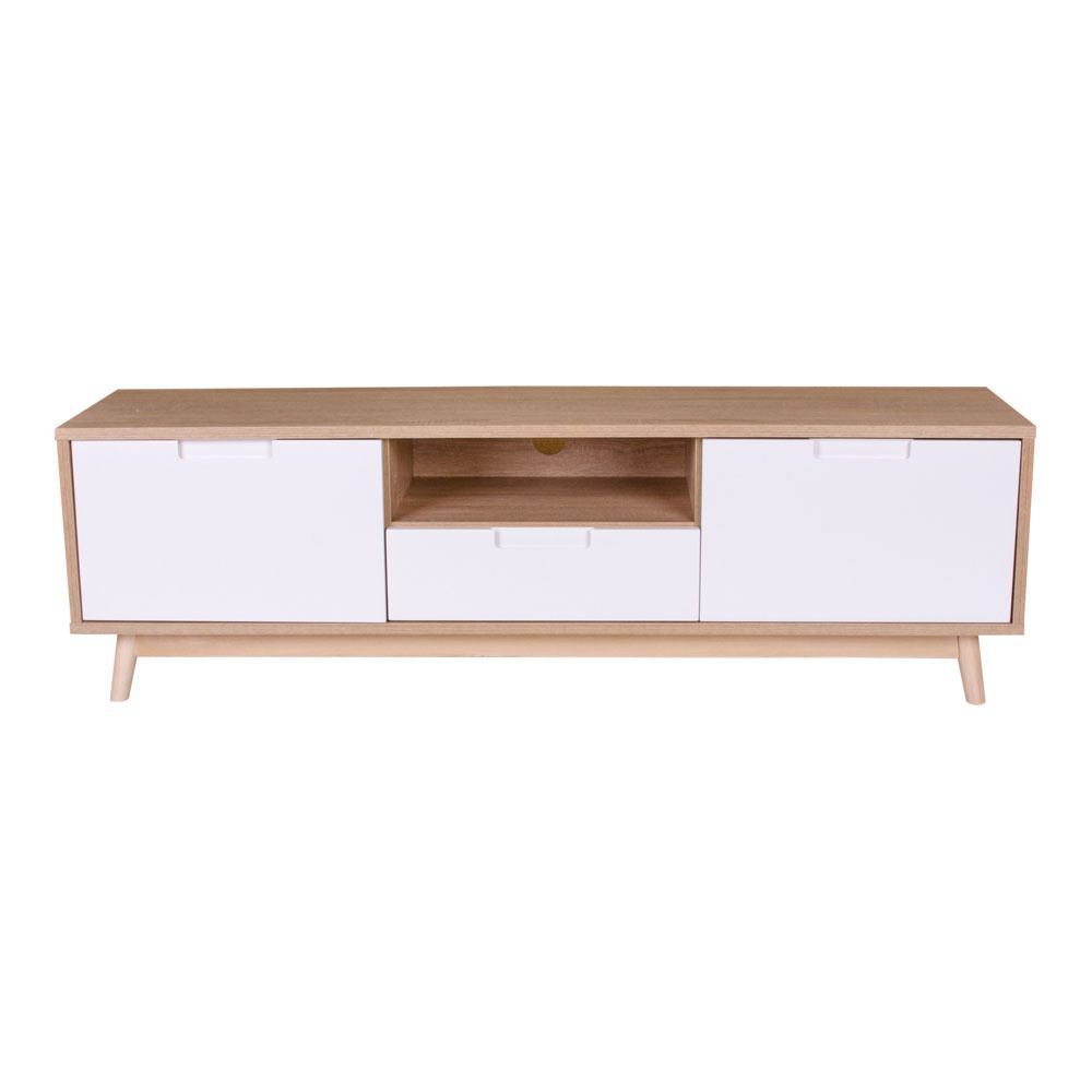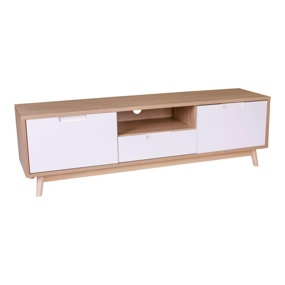 TV- bænk i natur med hvide låger. De 2 låger og skuffen giver god mulighed for opbevaring. Det er et lækkert og stilrent møbel som passer perfekt til stuen.