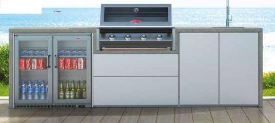 Grill Signature 2000S med 4 brændere, dobbeltdør køleskabsmodul, vask og standard moduler samt top.