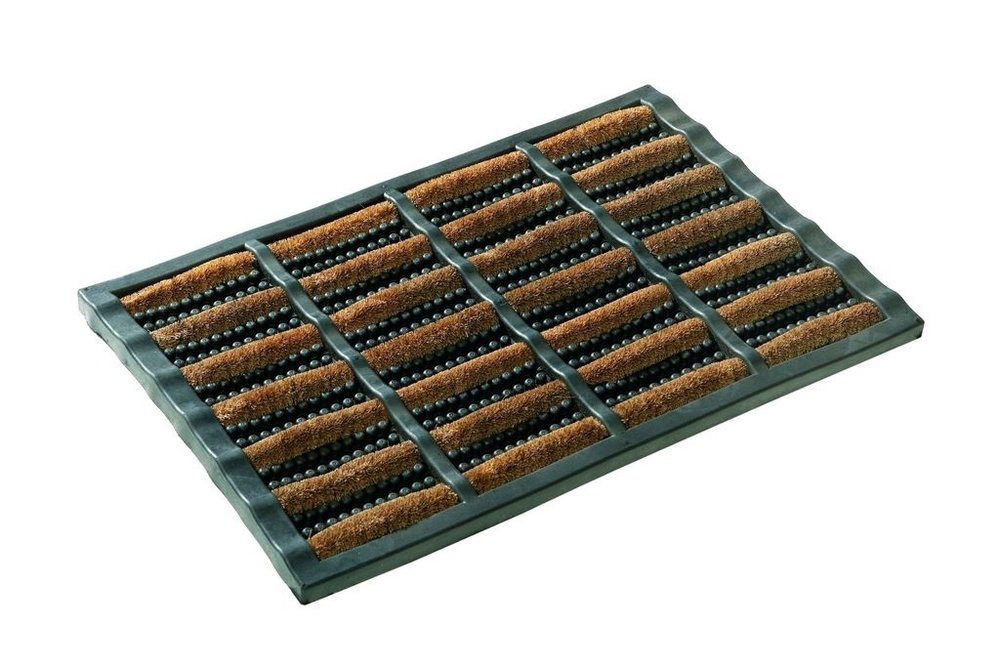 Gummi "dutter" tørrer groft snavs, mens kokos børster samtidig indsamler den fine snavs. Måtten er også skridsikker og modstår alle vejrforhold.