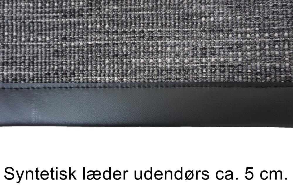 Herunder farverne på kantbånd i syntetisk læder til udendørs tæpper. Den synlige kant er ca. 5 cm. bred.