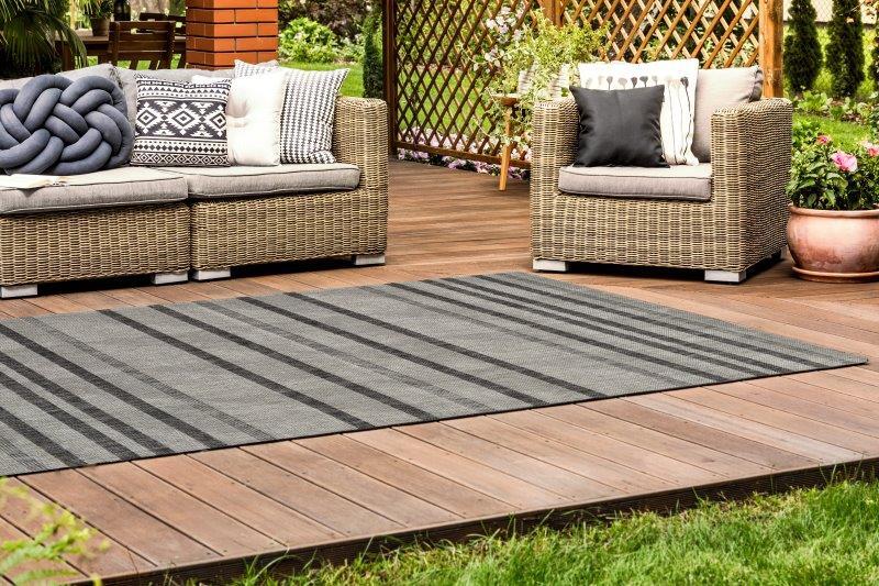 Fladvævet polypropylene tæppe til indendørs og udendørs brug.