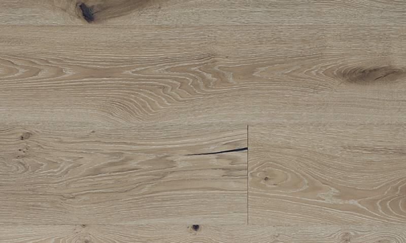 De lange, brede planker giver et helt unikt og naturligt udtryk. Træets naturlige detaljer kommer frem på flotteste vis. Overfladen er børstet hvid matlak, som fremhæver træets naturlige åretegninger, lysner gulvet naturligt samt giver en stærk og holdbar overflade.