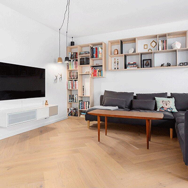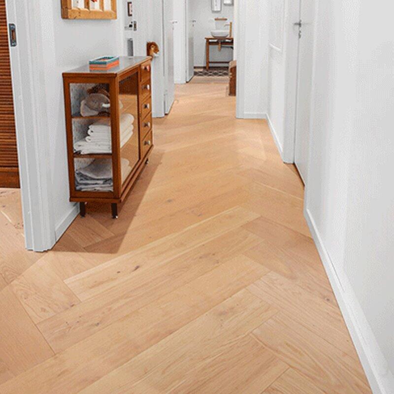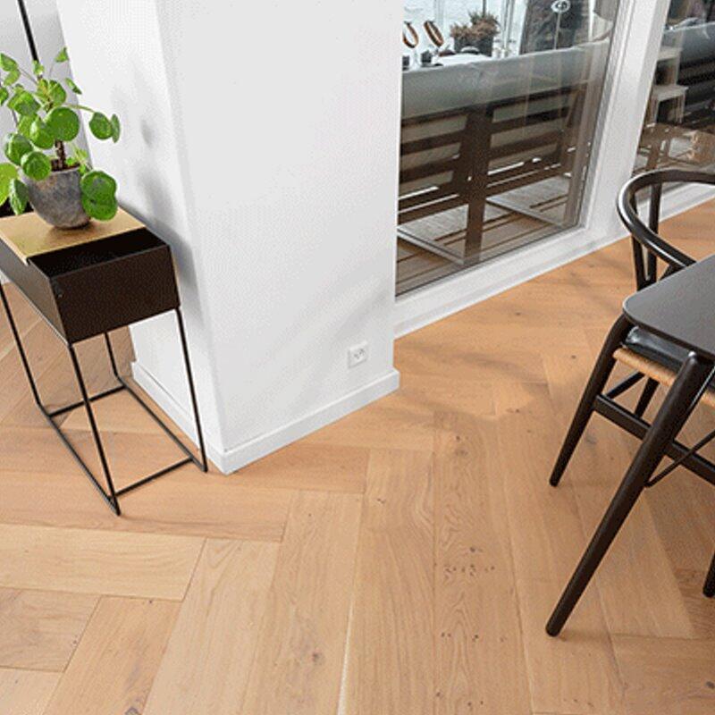 De 12 mm tykke og 1080 mm lange planker har fas på alle fire kanter, som fremhæver gulvets flotte mønster.